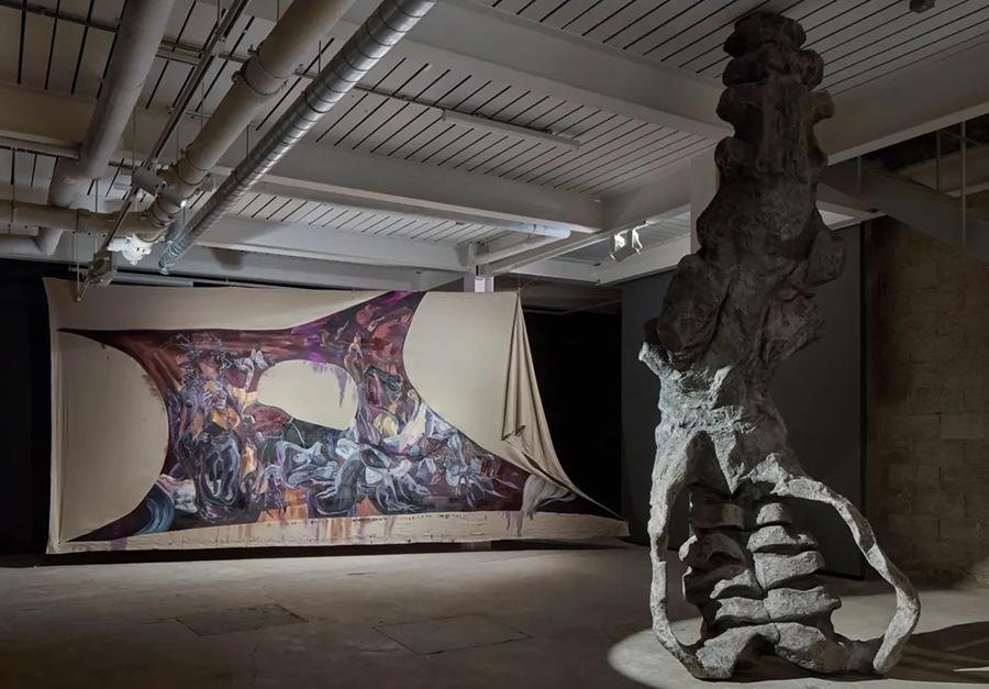 Central to the exhibition is a formidable skeletal sculpture that pierces through the floor, bridging the galleries. This imagined structure, designed as a skeleton for the painted skins, exudes a prehistoric and futuristic presence. It carries profound symbolism, representing Mynerva’s personal journey involving alterations of their own body. Notably, for previous exhibitions, the artist underwent procedures such as sewing their vagina shut for the “Closing to Open” exhibition in Madrid and removing a rib for “The Original Riot” showcased at the New Museum in New York.